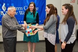 After the showing of the film, the students presented their interviewees with the gift of a DVD of the complete interview along with a picture of each team.Names, Not Numbers INC© is an interactive, multi-media Holocaust project created by educator, Tova Fish-Rosenberg. To date, 6,000 students have interviewed and filmed 2,000 survivors and World War II veterans throughout the United States, Canada, and Israel as part of the project. It is generously supported by a prominent national foundation, and all 200 documentary films Names, Not Numbers has produced have been accepted into the archives of the Jewish National and University Library of Israel at the Hebrew University of Jerusalem. In addition, they are being archived at Yad Vashem and the Mendel Gottesman Library at YU.